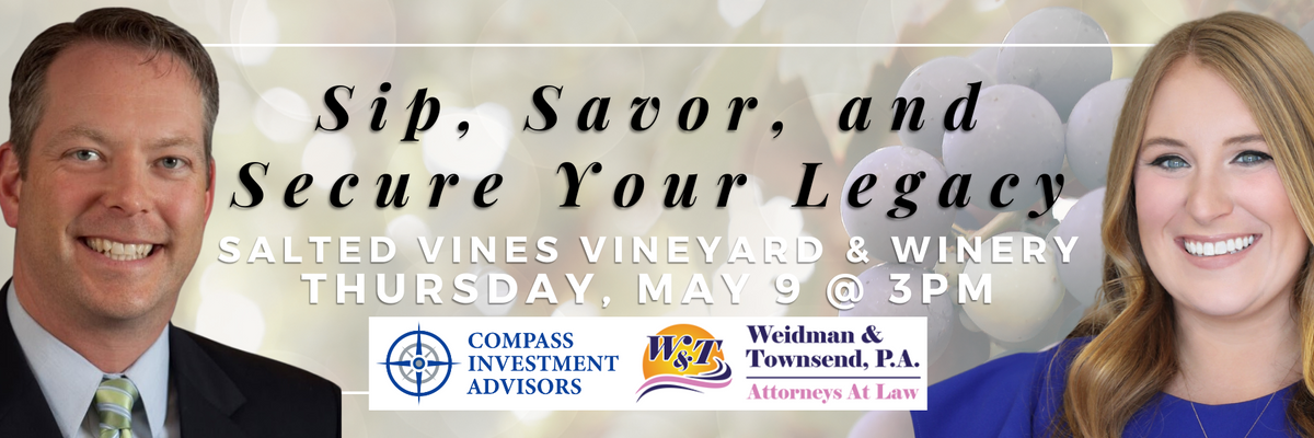 Join Dan Rowles, CFP® from Compass Investment Advisors and Veronica Townsend, ESQ from Weidman & Townsend, P.A. for an informative discussion about properly securing your legacy while trying some of the latest wines from Salted Vines Winery. We hope to see you there!